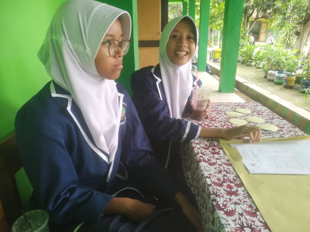 “Ini kita jualan, Snack,yogurt, es mambo,rambut nenek. juga ada Totbag dengan hiasan batik Ceprot dari bahan tumbuhan,” papar Retno Mujiasih, dari kelas VIII D.